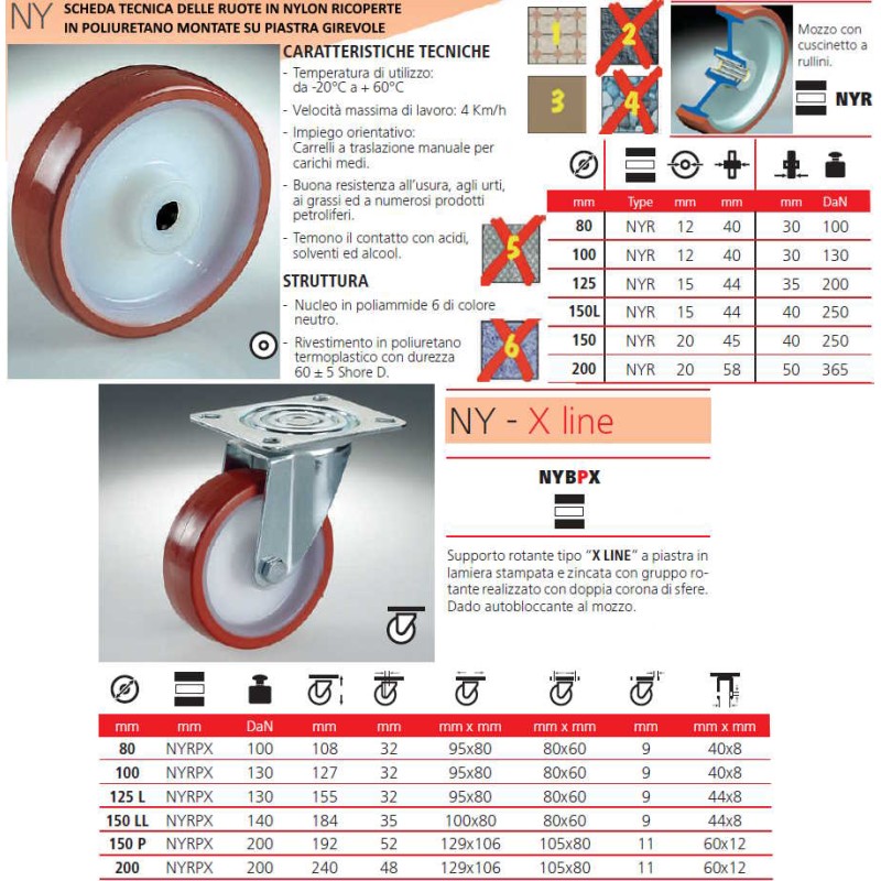 Ruota in nylon ricoperta in poliuretano con nucleo in poliammide 6 di colore neutro e rivestimento in poliuretano termoplastico con durezza 60 ± 5 shore d. adatta anche su pavimentazione irregolare, montata su supporto tipo x-line a piastra in lamiera stampata e zincata con gruppo rotante realizzato con doppia corona di sfere e dado autobloccante al mozzo..