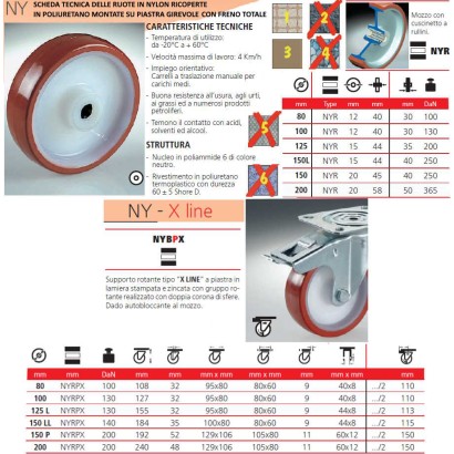 Ruota in nylon ricoperta in poliuretano con nucleo in poliammide 6 di colore neutro e rivestimento in poliuretano termoplastico con durezza 60 ± 5 shore d. adatta anche su pavimentazione irregolare, montata su supporto a staffa girevole con freno totale tipo x-line a piastra in lamiera stampata e zincata con gruppo rotante frenante realizzato con doppia corona di sfere e dado autobloccante al mozzo..