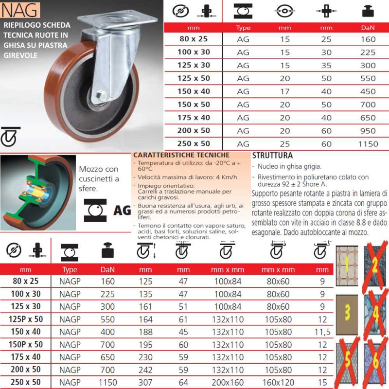 Ruota in poliuretano con nucleo in ghisa con supporto pesante rotante a piastra in lamiera di grosso spessore stampata e zincata con gruppo con piastra a staffa rotante realizzato con doppia corona di sfere assemblato con vite in acciaio in classe 8.8 e dado esagonale. Dado autobloccante al mozzo..