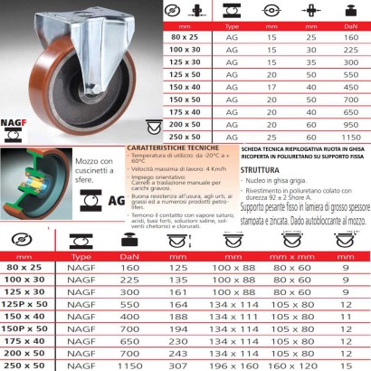 Ruota in poliuretano con nucleo in ghisa con supporto pesante fisso a piastra in lamiera di grosso spessore stampata e zincata con supporto pesante fisso in lamiera di grosso spessore stampata e zincata. Dado autobloccante al mozzo.
