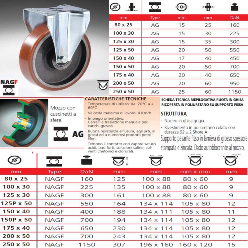 Ruota in poliuretano con nucleo in ghisa con supporto pesante fisso a piastra in lamiera di grosso spessore stampata e zincata con supporto pesante fisso in lamiera di grosso spessore stampata e zincata. Dado autobloccante al mozzo.