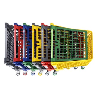 Carrello self-service con robusto cesto in plastica che rende il carrello maneggevole e più facile da movimentare rispetto ai carrelli spesa in filo metallico, disponibile in diversi colori.