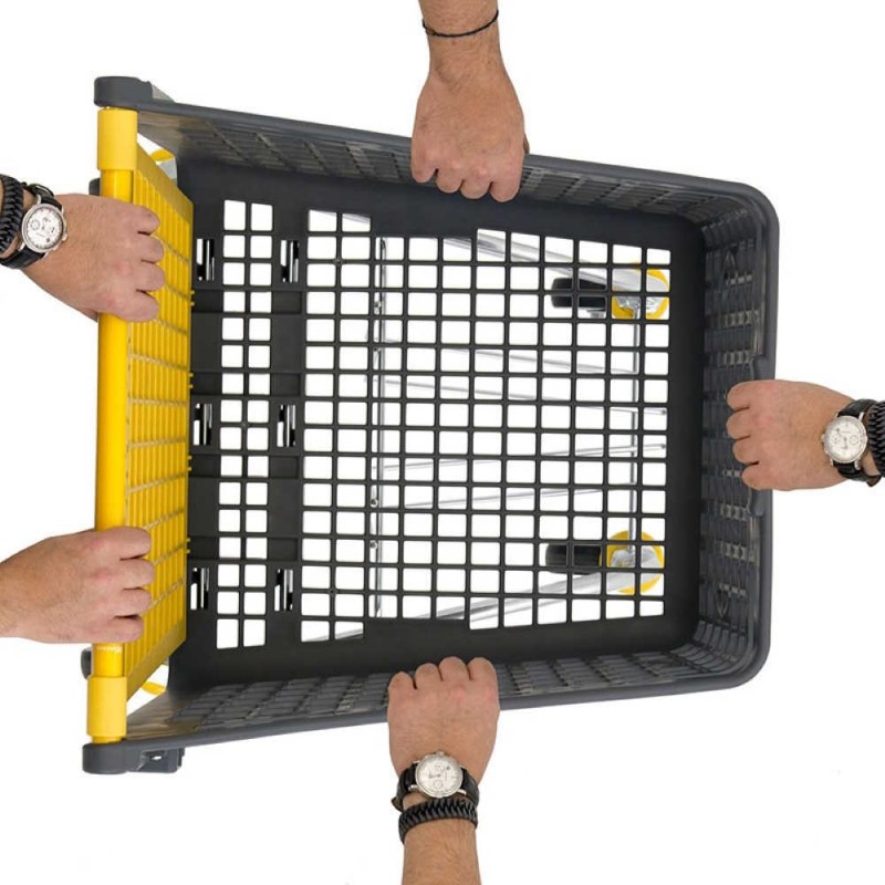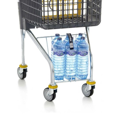Carrello per supermercato di ridotte dimensioni e può essere imbottigliato in solo 125 mm ed è direzionabile a 360° ed è dotato di supporto porta acqua al di sotto del cesto che aggiunge 10 litri in più alla capienza totale del carrello.