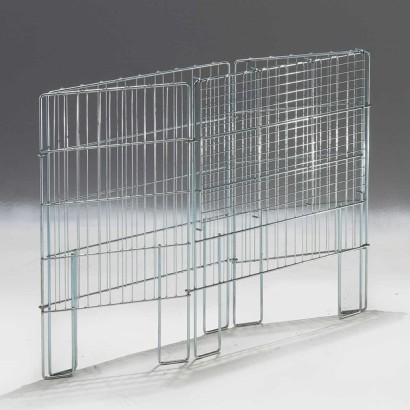 Cesto espositore bancarella promozionale pieghevole per ipermercati, negozi, supermercati, discount, mercati realizzata in filo metallico zincato elettroliticamente, dotata di pianale con fondo regolabile in diverse altezze, che garantisce grande visibilità ad ogni prodotto esposto, i cui tondini di acciaio sono ripiegati ad anello per evitare graffi alle mani e danneggiamento dei prodotti tessili e alimentari in esso contenuti.