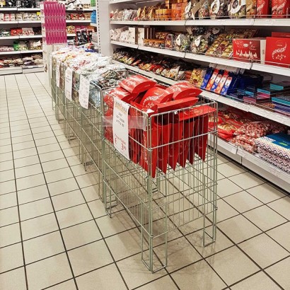 Cestone bancarella espositiva utile per l'esposizione di merci e prodotti promozionali per arredamento negozi nei centri commerciali, di abbigliamento o di profumerie per prodotti promozionali a centro corsia tra gli scaffali oppure fronte banco cassa, avancassa.
