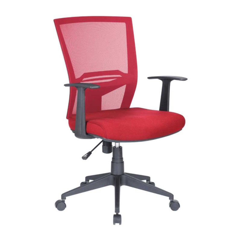 Sedia poltrona operativa, girevole e regolabile, per ufficio da scrivania, con rivestimento seduta in tessuto imbottito rosso con rivestimento schienale in rete tecnica traspirante rossa, dotata di braccioli in polipropilene nero, per arredamento di design, moderno, professionale per casa, studio, ufficio, congressi, show-room e per qualsiasi ambiente lavorativo, costruita con materiali di qualità, che la rendono duratura nel tempo.