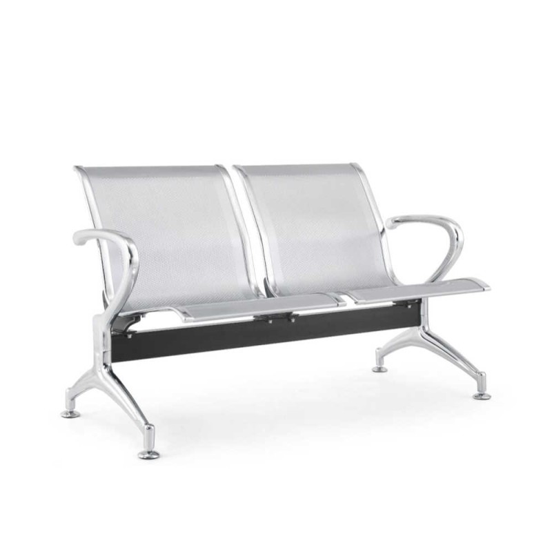 Panca per sale d'attesa Indoor a 2 posti in acciaio microforato con trattamento antiruggine e verniciatura elettrostatica di colore grigio, con gambe, profili e braccioli in acciaio cromato, ideali e specifiche per ospedali, aeroporti, locali pubblici, uffici, studi medici, musei.