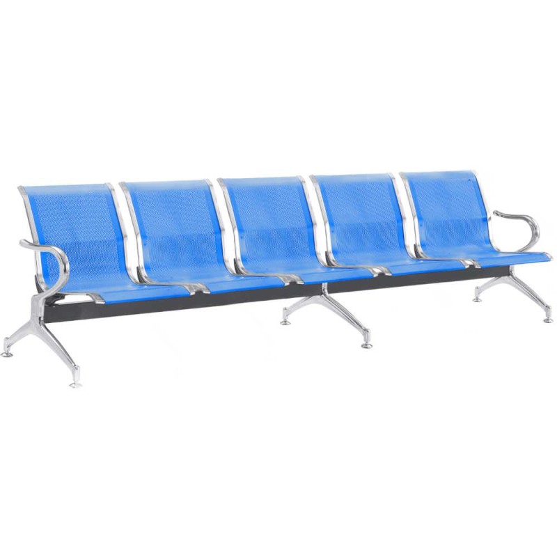 Panca per sale d'attesa Indoor a 5 posti in acciaio microforato con trattamento antiruggine e verniciatura elettrostatica di colore blu, con gambe, profili e braccioli in acciaio cromato, ideali e specifiche per ospedali, aeroporti, locali pubblici, uffici, studi medici, musei.