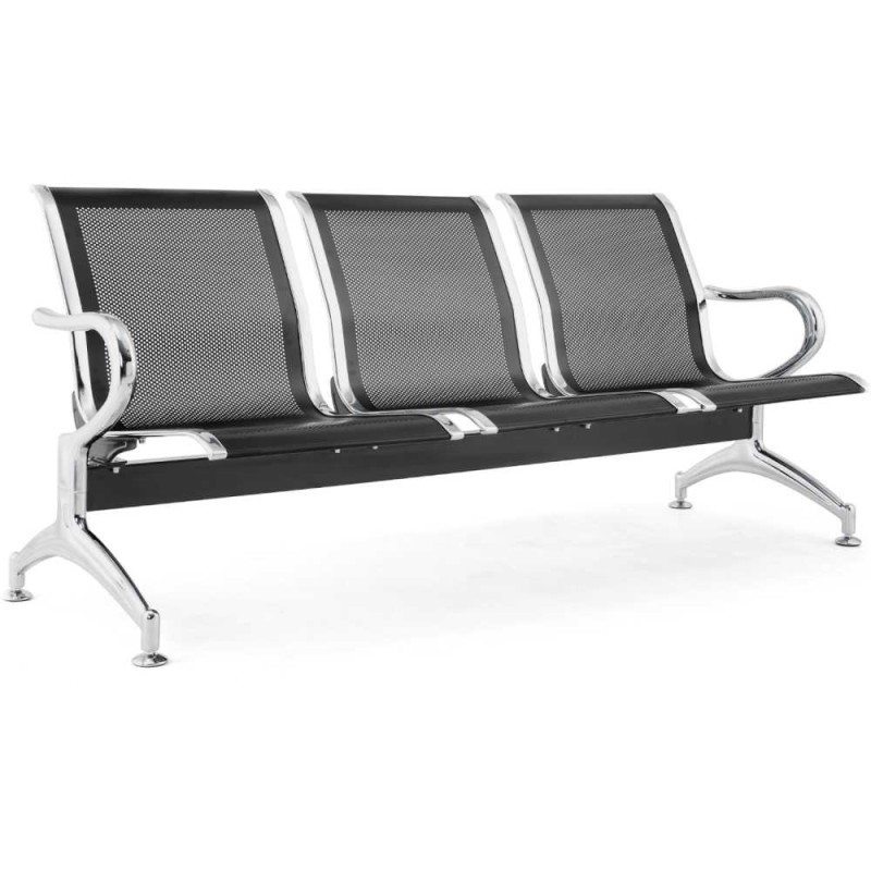 Panca per sale d'attesa Indoor a 3 posti in acciaio microforato con trattamento antiruggine e verniciatura elettrostatica di colore nero, con gambe, profili e braccioli in acciaio cromato, ideali e specifiche per ospedali, aeroporti, locali pubblici, uffici, studi medici, musei.