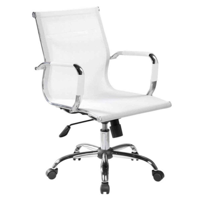 Poltrona direzionale per casa ed ufficio, in rete bianca versione Dallas con rivestimento seduta e schienale in rete tecnica traspirante colore bianco e struttura e braccioli in acciaio cromato + copertura nera in PU e razze in acciaio cromato con ruote piroettanti nere in nylon e sistema di elevazione a gas per la regolazione del sedile e della seduta in altezza, scorrimento cm. 10.