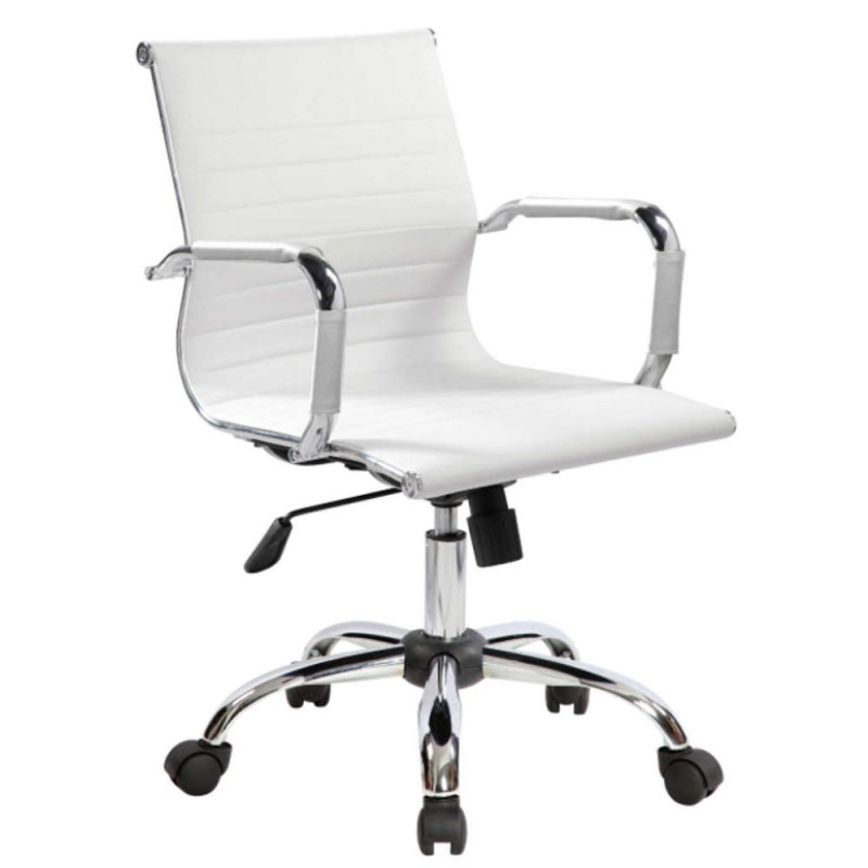 Poltrona direzionale per casa, studio ed ufficio, in PU bianco versione Dallas con rivestimento seduta e schienale in PU colore bianco con struttura, razze e braccioli in acciaio cromato + copertura nera in PU e con ruote piroettanti nere in nylon.