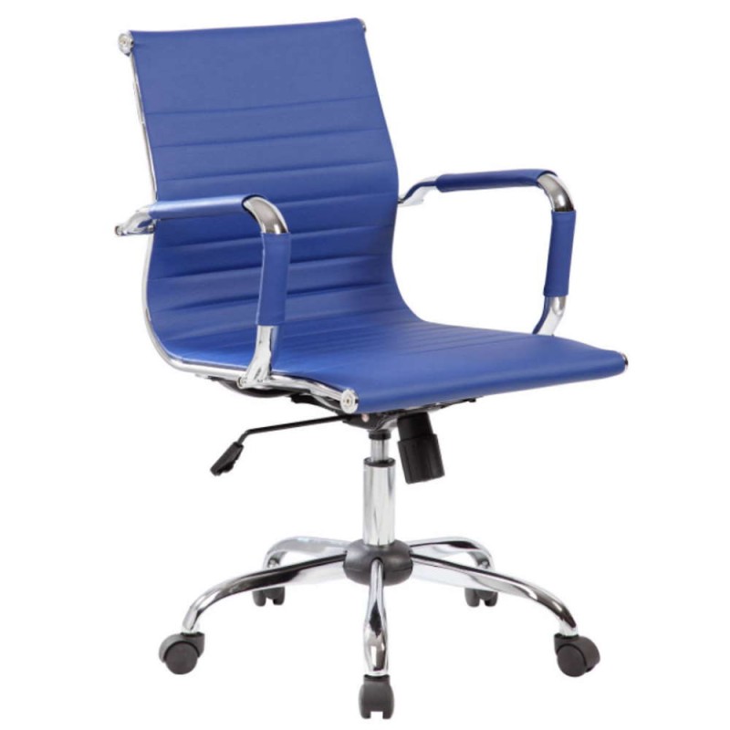 Poltrona direzionale per casa, studio ed ufficio, in PU blu versione Dallas con rivestimento seduta e schienale in PU colore blu con struttura, razze e braccioli in acciaio cromato + copertura nera in PU e con ruote piroettanti nere in nylon.