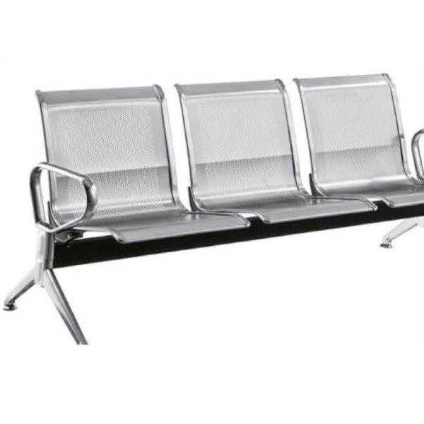 Panca per sale d'attesa in acciaio inossidabile 201, caratterizzata da una seduta in lamiera microforata nella colorazione acciaio grigio lucido, specifiche per ospedali, aeroporti, locali pubblici ad alta frequentazione, resistenti, traspiranti, e di facile pulizia ed igienizzazione.