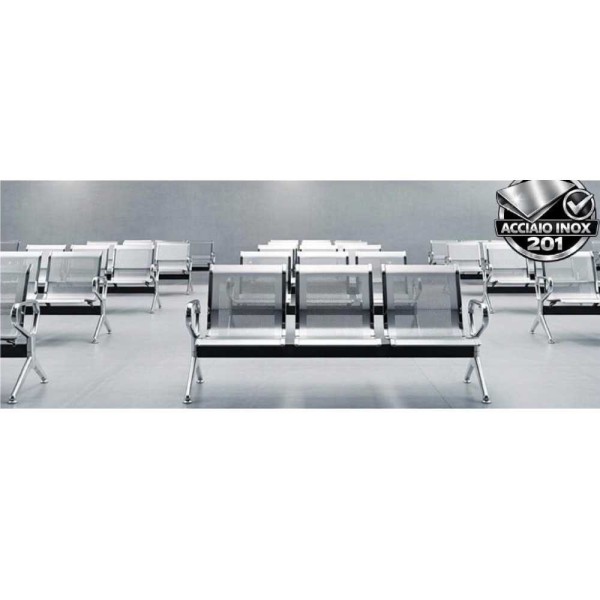 Panche professionali a 3 posti realizzate con braccioli e gambe in tubo molto robusto, in acciaio inox 201 con spessore lamiera di circa 1,5 mm., con profili spesso-cromati per una finitura lucida, specifiche per ospedali, uffici, studi medici, musei, sale d'attesa aeroportuali e stazioni ferroviarie, uffici postali, banche, grandi centri direzionali.