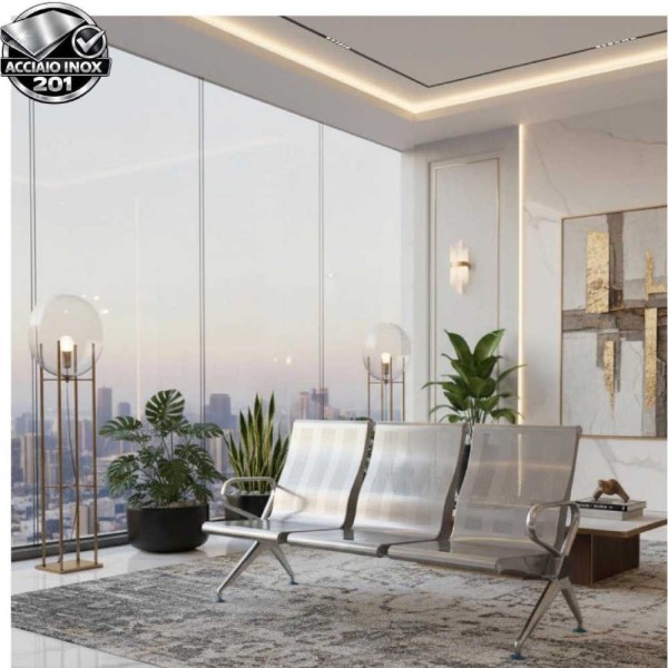 Panche professionali a 3 posti realizzate con braccioli e gambe in tubo molto robusto, in acciaio inox 201 con spessore lamiera di circa 1,5 mm., con profili spesso-cromati per una finitura lucida, specifiche per ospedali, uffici, studi medici, musei, sale d'attesa aeroportuali e stazioni ferroviarie, uffici postali, banche, grandi centri direzionali.
