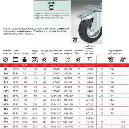 Ruota industriale con supporto girevole con freno ideale per essere utilizzata per la movimentazione e lo spostamento di carrelli, pianali, contenitori, strutture, carichi e pesi di media portata, per il trasporto di merci su pavimentazione interna ed esterna in aziende, magazzini, cantine, uffici, supermercati, mercati, negozi, alberghi, bar mense, fabbriche, centri logistici.