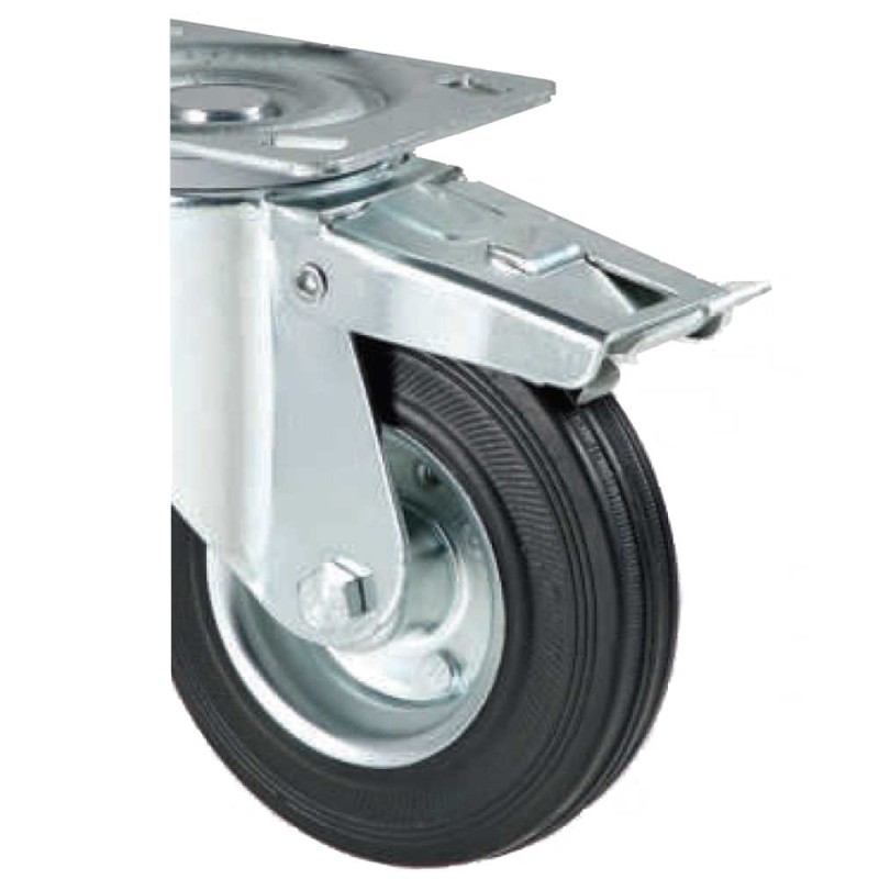Ruota su piastra girevole con freno totale, ovvero realizzata con blocco sia della rotazione della ruota che della staffa e permette di tenere fermo l'eventuale carrello su strade in pendenza o semplicemente per bloccarne i movimenti.