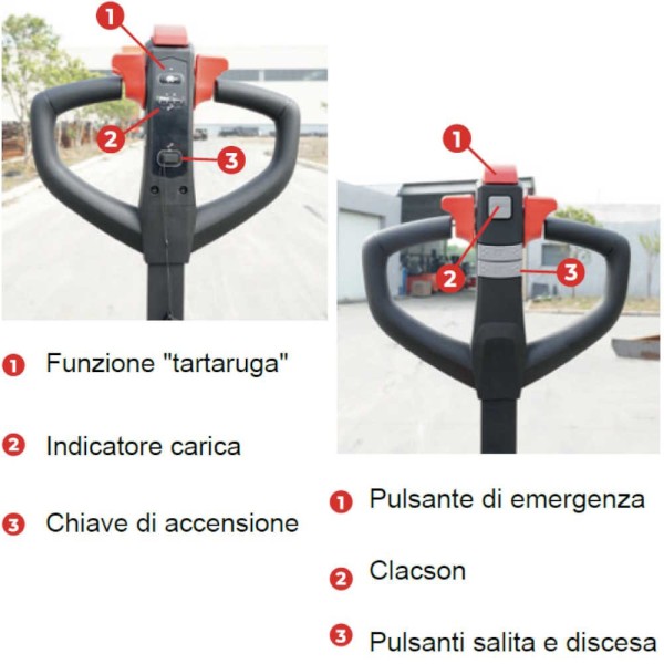 Carrello Transpallet elettrico elevatore semovente con portata Kg.2000 con comandi sul timone multifunzione, per un rapido, intuitivo e facile controllo nelle operazioni di lavoro del transpallet nel trasporto delle merci e dei carichi, nel sollevamento e spostamento di bancali, nelle fasi di carico e scarico da camion e furgoni e nella movimentazione in genere per la logistica in capannoni, fabbriche, aziende, industrie e laboratori.